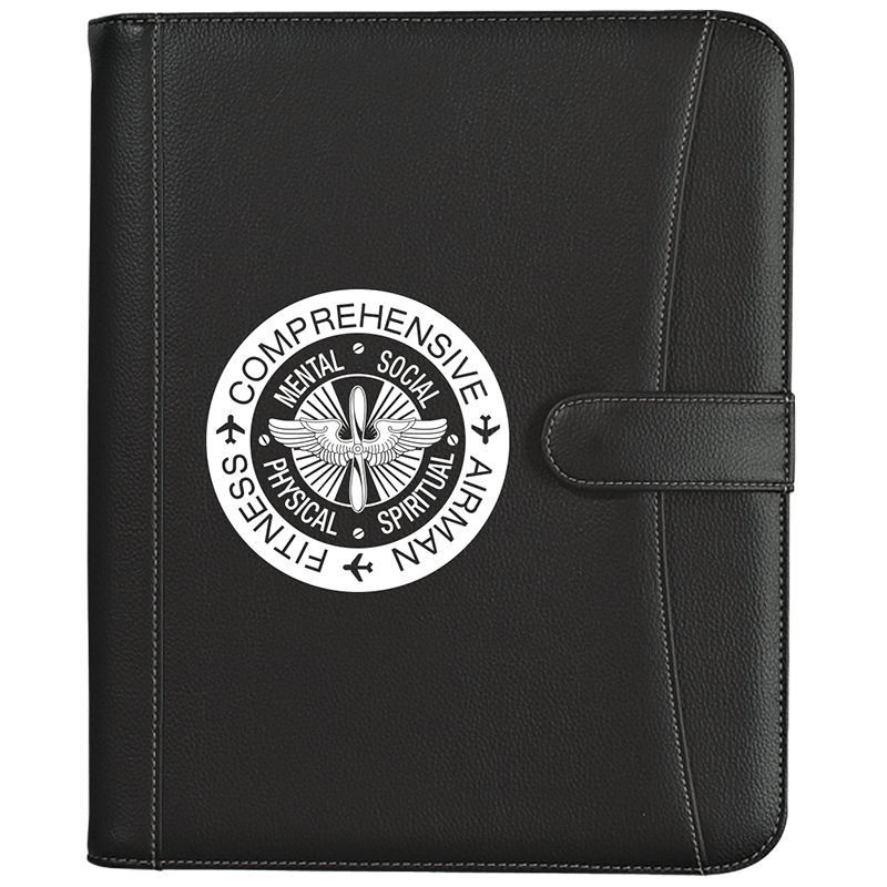 Includes 30 page 8 ½" x 11" writing pad, outside zipper for security, 4 card holders, elastic pen loop, mesh ID holder and calculator. Also has outside front pocket and snap closure. **If adding a QR code to this product, there is a fee. Please contact your Account Specialist for details.**