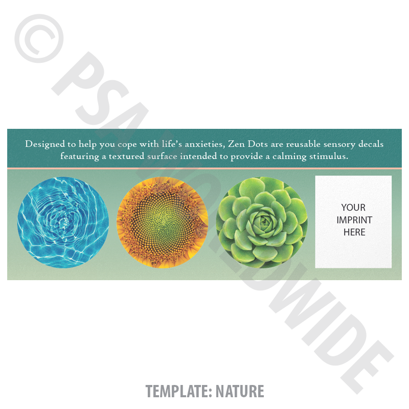 Our exclusive Zen Dots ® are designed to help you deal with life's anxiety and stress. Zen Dots® are 1.5" sensory decals that feature a mild but soothing textured surface. Zen Dots ® can be placed just about anywhere: your phone, desk, laptop, or notebook and are repositionable. The textured surface can provide a calming and comforting sensation when rubbed. Includes your full-color imprint.