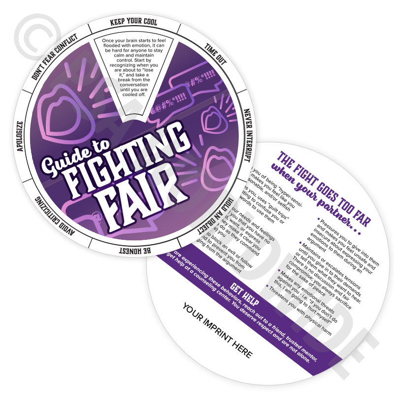 PVC wheel rotates to reveal information related to relationship violence and how to fight fair when having an argument. Front of wheel topics include: