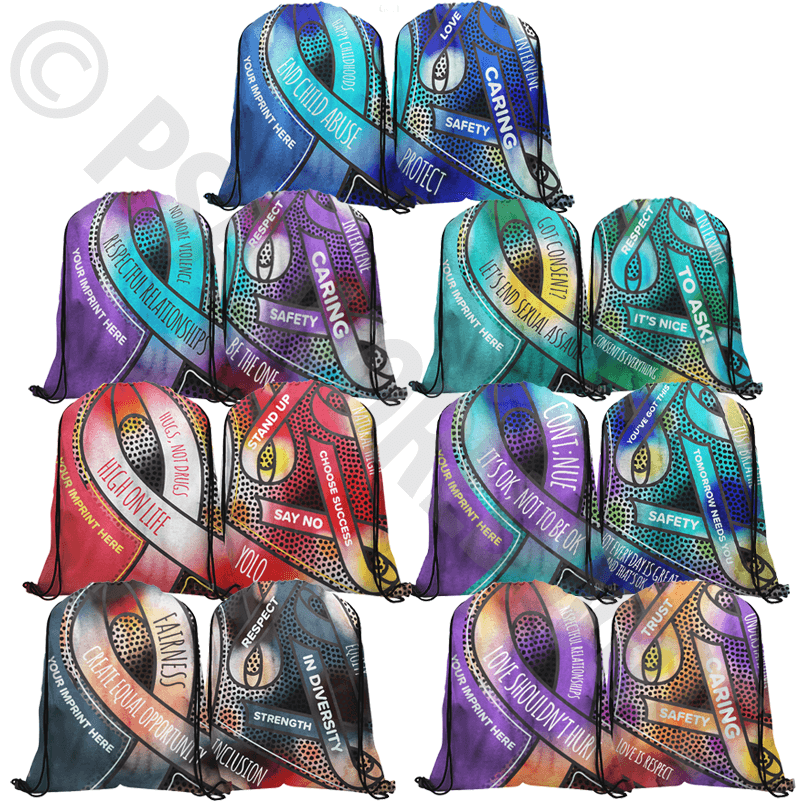 Our bestselling dye-sublimated cinch backpack now comes with full color awareness program designs and your custom imprint. Choose a design that corresponds with your awareness program.