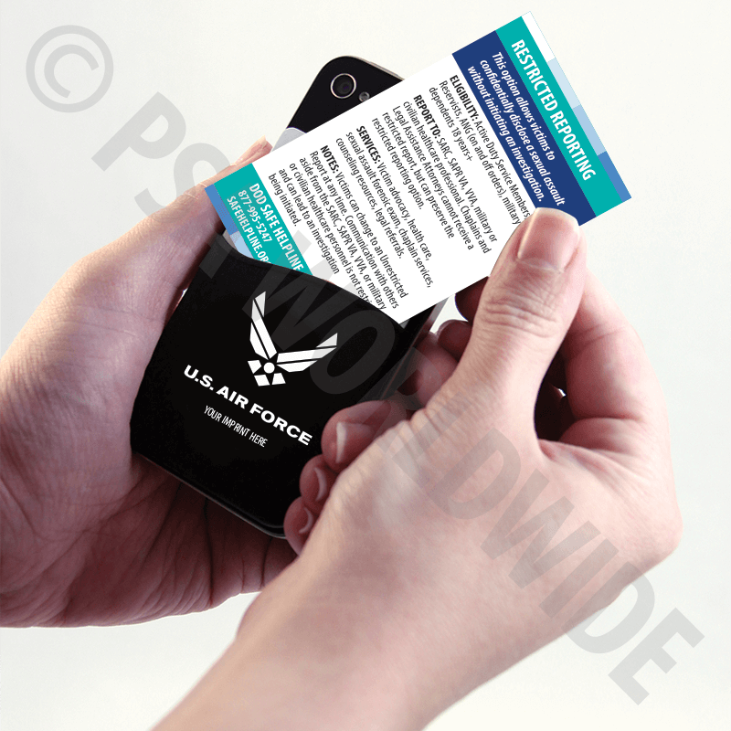 Customized silicone phone pocket attaches to the back of your phone to hold an ID, credit cards, etc. Includes educational wallet card with facts about restricted / unrestricted reporting options for Air Force and how to get help if you are assaulted. **Customer must confirm the accuracy of the repotting options content.**