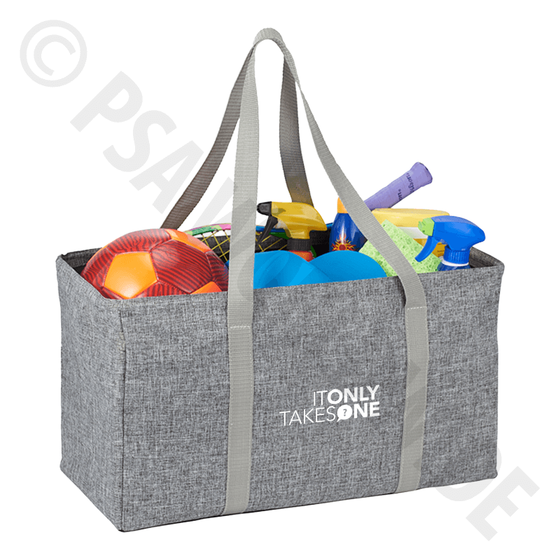 oversized, sturdy tote hauls the whole family! Use for groceries, sporting equipment, toys, etc. Features a wire-rimmed top for sturdiness and shape and 14" handles.