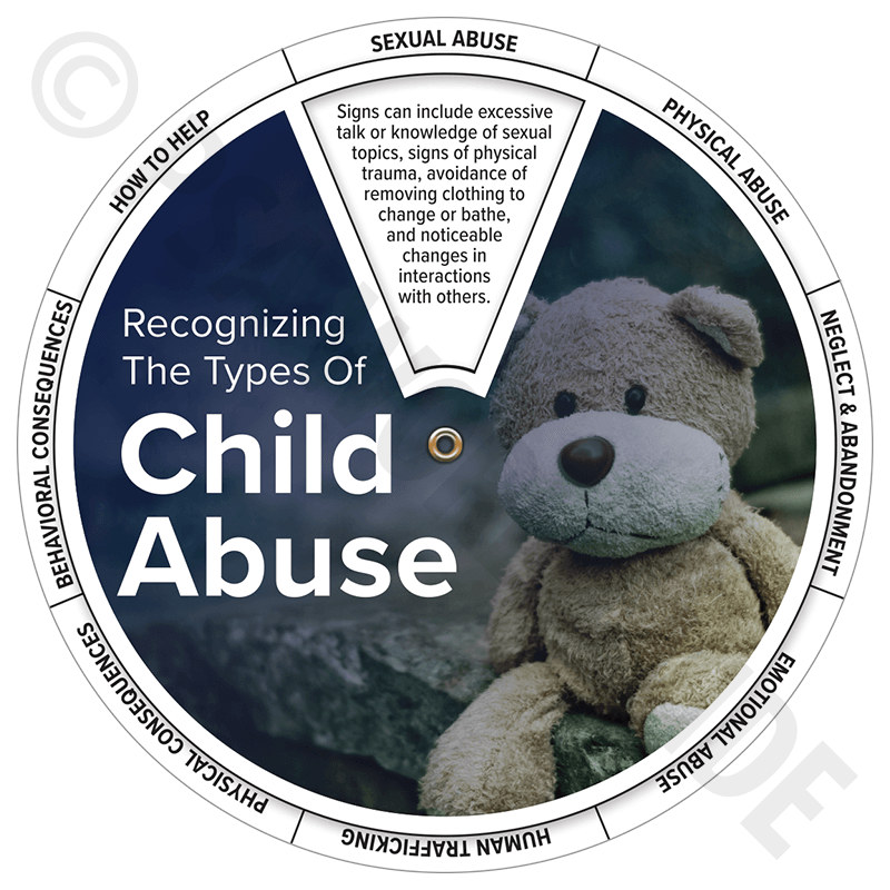 PVC wheel rotates to reveal information related to recognizing the different types of child abuse. Topics include: