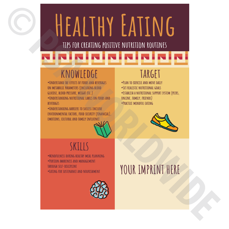 Use our exclusive design 5" x 7" magnet. Choose from two different templates. One features tips for creating positive nutrition routines and the other is about diabetes in Native American & Alaskan Native communities. Magnet is for indoor use only. *Includes full-color imprint in one location*
