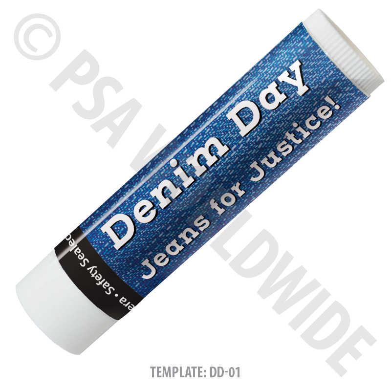 This SPF 15 lip balm is made in America and is FDA compliant and PABA free. Choose your flavor and Denim Day template. All templates will be printed on a metallic label. Includes your full-color imprint in one location.
