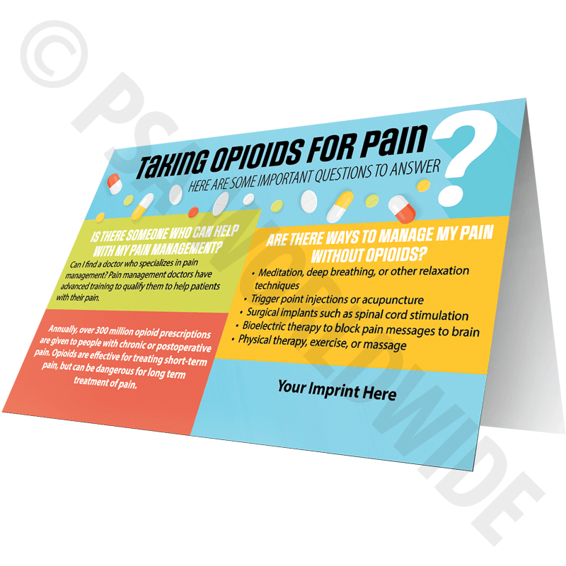 Our exclusive designed table tent shows some important questions to ask yourself if you’re taking opioids for pain. Made of sturdy, folded plastic, our table tents can be in a variety of environments to educate on different program awareness and prevention. Includes your full-color imprint on both sides. Tent ships as a flat 10" x 8" sheet.