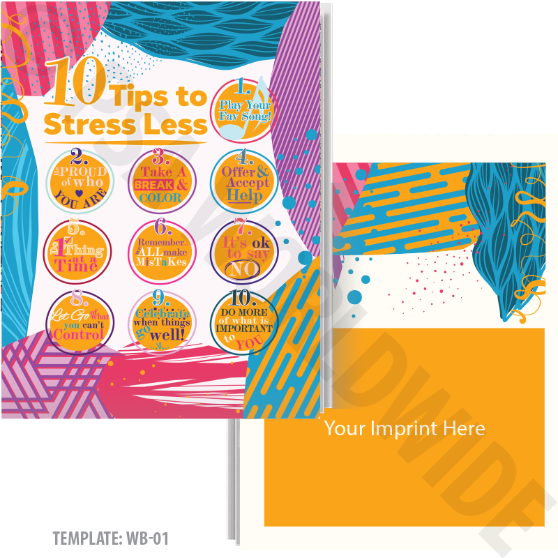Need 10 ways to stress less? What better way than with our coloring book that gives you tips as well as 24 fabulously detailed pieces of art, printed on one side of a perforated white page. Choose your coloring book theme and front cover template. Includes your full-color imprint on the back cover! Full size (8" x 10.5") book with heavy duty cover.