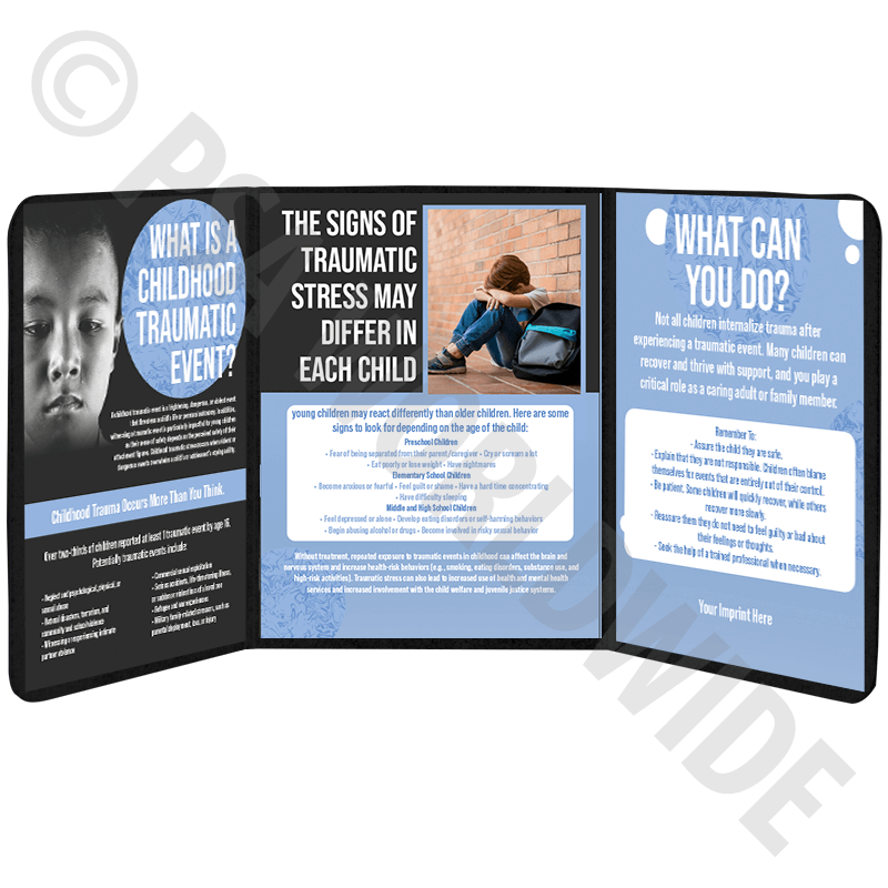 This exclusive table display provides three panels of information on childhood truama and child abuse prevention. Topics include: