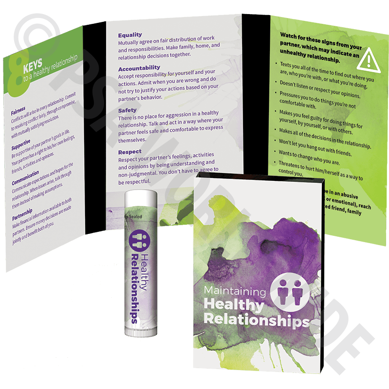 Tri-fold wallet-sized brochure covering characteristics of healthy relationships, and warning signs of an unhealthy relationship. Includes a customized lip balm.