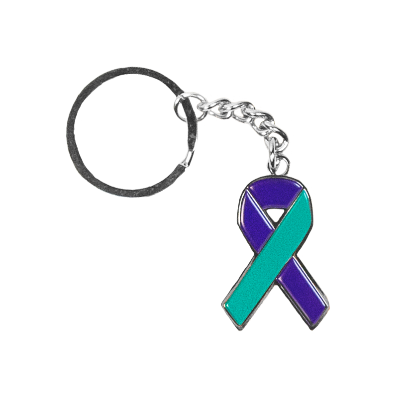 **This item is on closeout. Please contact your account specialist to confirm the available inventory.** Show your support for Suicide Prevention with this purple and teal metal keychain. Features a split ring attachment and your custom text imprint can be engraved on the back.