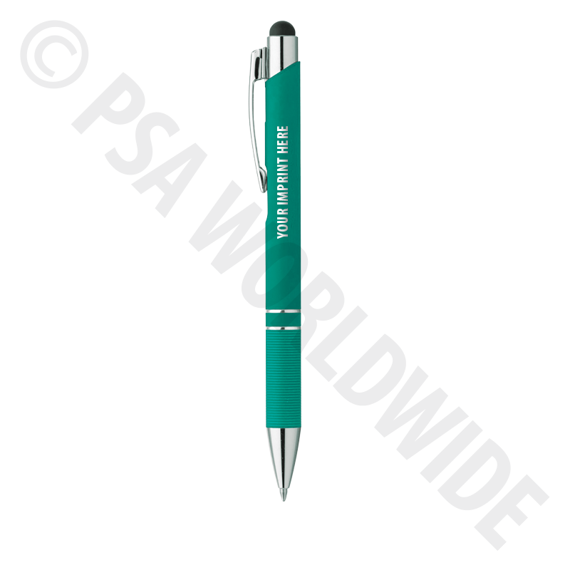Our exclusive teal colored, soft touch pen is perfect for everyday use. Plunger-action ballpoint pen features shiny silver accents and clip, comfort ringed grip, and a handy top stylus. Pen comes with black ballpoint ink. Add your imprint (white only) to pen barrel.