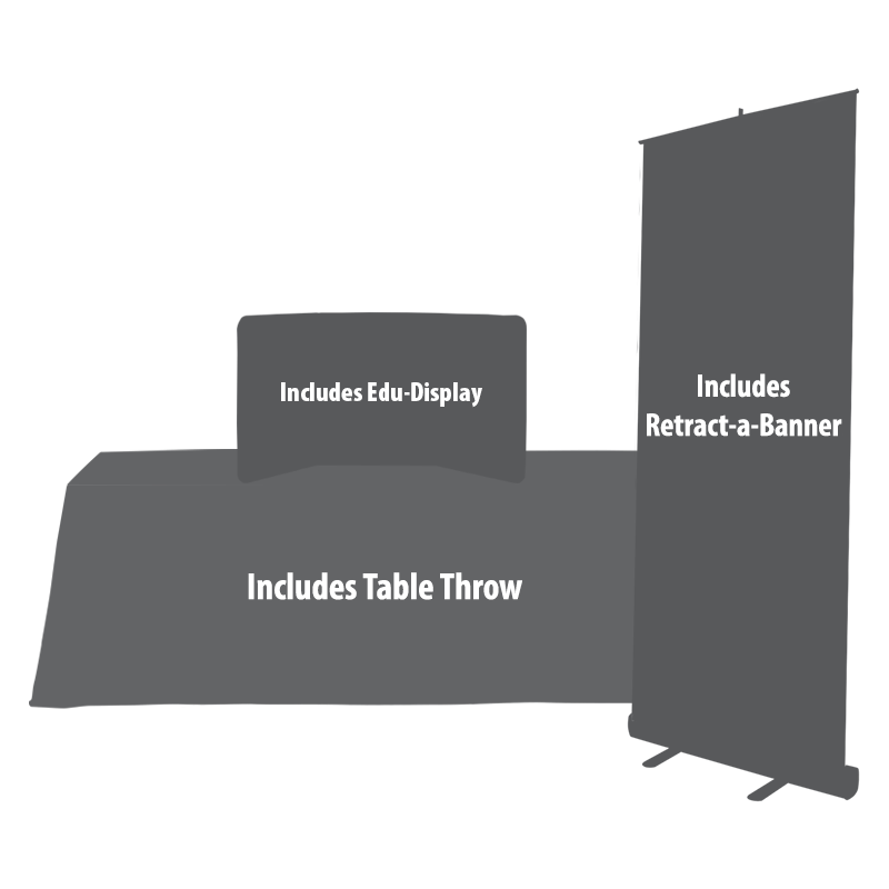 You get to choose from any of our existing designed Retract-a-banners (PSA#1595), convertible full-color throws (PSA#1480 or #1480N) and one edu-display. You can choose #3640 custom edu-display instead but that is an additional cost. Add your custom imprint to all 3 kit components. Call your account specialist to discuss all of your options.