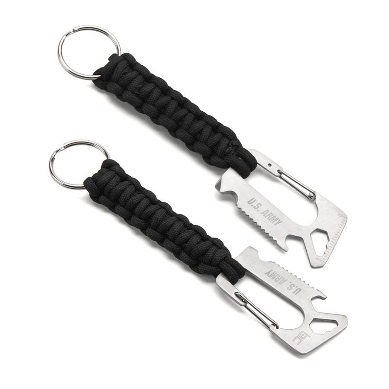 7-in-1 Multi-Tool Carabiner with black paracord includes: ruler, 4/6/8MM wrench, bottle opener, file, cord cutter, and flathead screw driver. Comes with a handy silver split ring. Includes your laser engraved imprint.