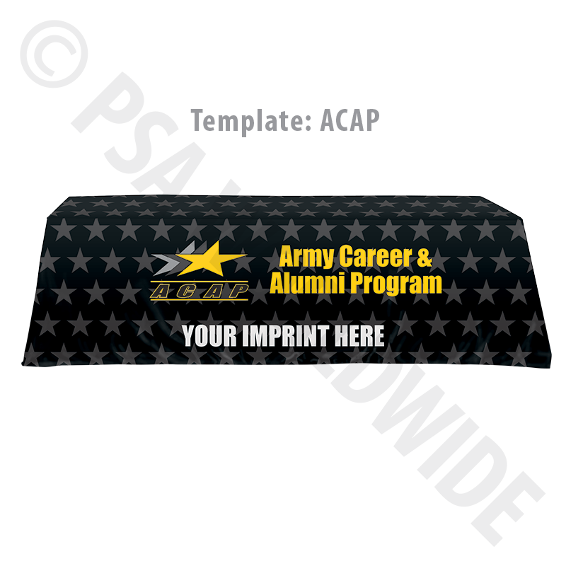 It's a big dilemma when choosing a table throw for events… which size do you purchase? The answer is this adjustable throw with convenient Velcro tabs to accommodate six or eight foot table lengths. Fabric is dyed to your custom color, with your full-color imprint. **Additional fees may apply based on your concepts and art needs. **