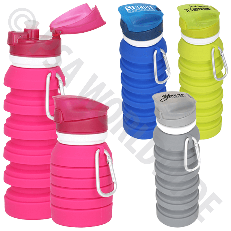 Our 16 oz. collapsible silicone water bottle collapses for easy transport. Add your custom imprint on the lid and promote your program or cause!