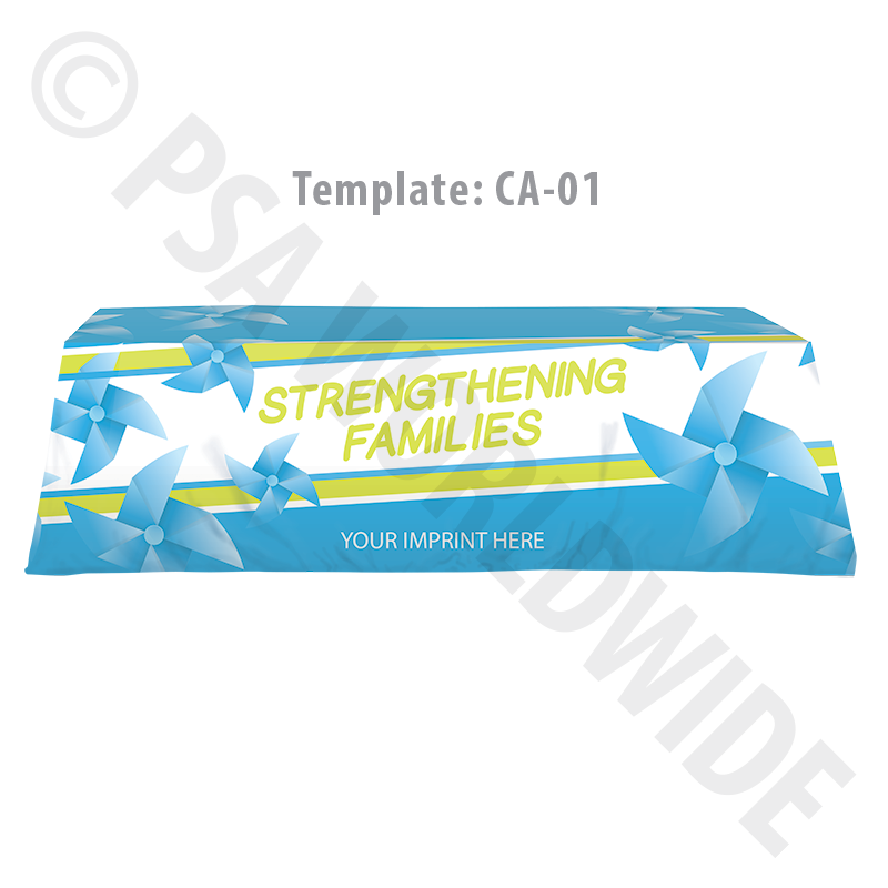 It's a big dilemma when choosing a table throw for events…... which size do you purchase? The answer is this adjustable throw with convenient Velcro tabs to accommodate six or eight foot table lengths. Fabric is dyed to your custom color, with your full-color imprint.