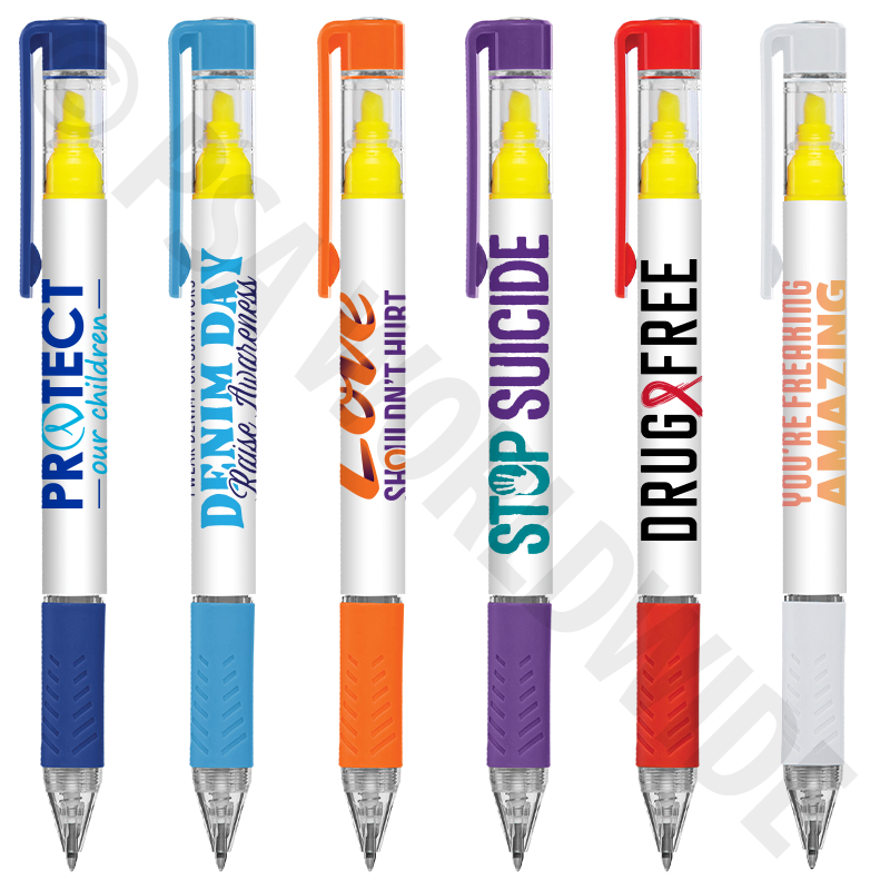 Our pen-highlighter combines a ballpoint pen with a yellow felt-tip highlighter at the opposite end. Combo writer features a full-color wrap design. Choose your ink color and matching trim and grip color. Includes your full-color imprint on the white barrel of highlighter pen.