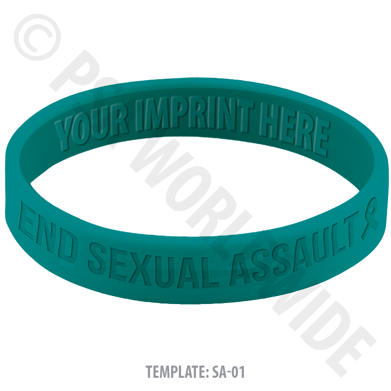 Our new TEAL silicone wristband comes debossed on the outside with one of our Sexual Assault prevention messages and includes your embossed imprint on inside of wristband. **