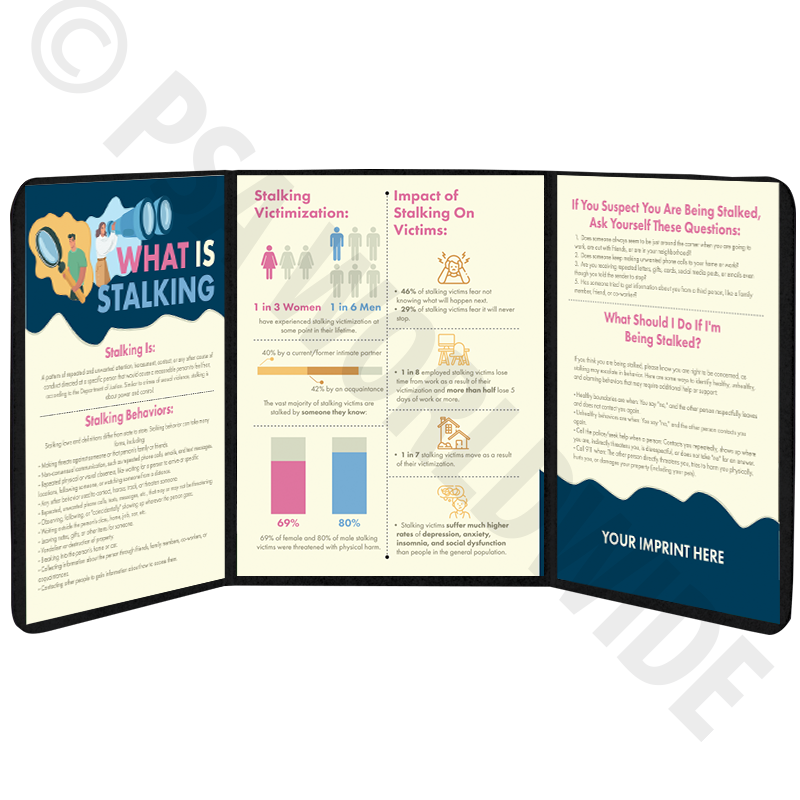 This exclusive tabletop display offers 3 panel which covers the topics related to stalking awareness. Topics include: