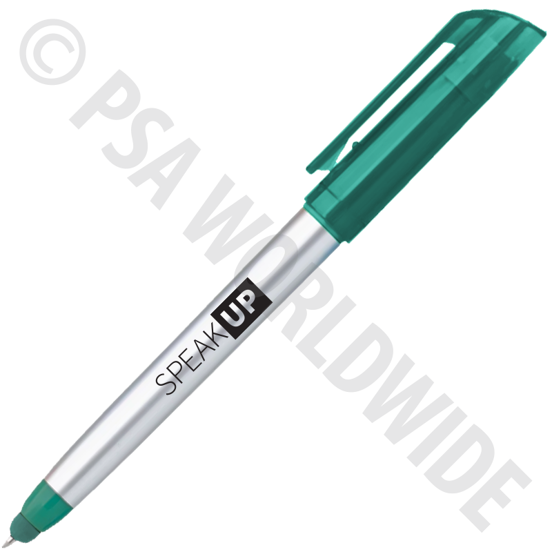 You’ll love our exclusive twist-action, multi-functional stylus pen and highlighter. Features a silver barrel, teal colored highlighter, teal colored stylus, and teal accents. The pen comes with black, medium-point ink. Remove translucent teal cap to reveal the teal colored highlighter. Includes your one-color imprint on barrel.