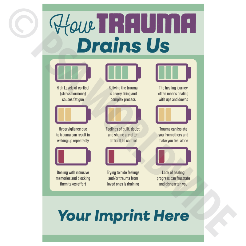 Our exclusively designed full-color indoor magnet is designed to show the cycle of how trauma can be draining to you. Includes your full-color custom text and/or logo on front of magnet. Back is blank.