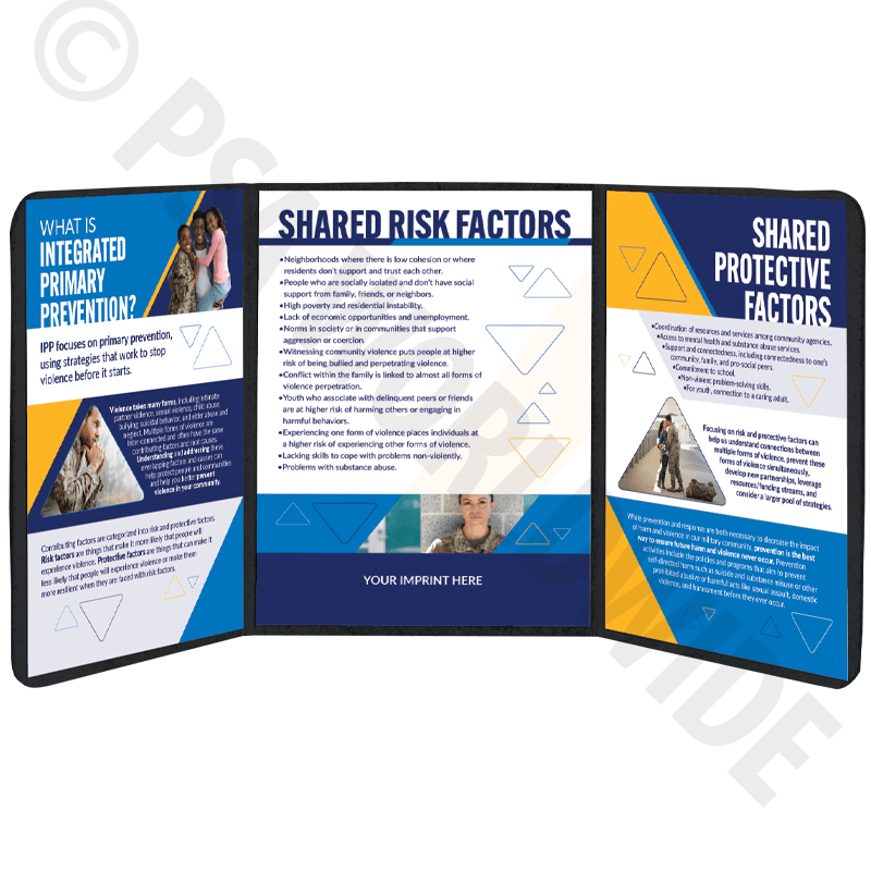 Display talks about what integrated primary prevention is, IPP risk factors, IPP protective factors, and strategies to stop violence. The information on this product can be changed to include your base or installation's hotlines and resources.