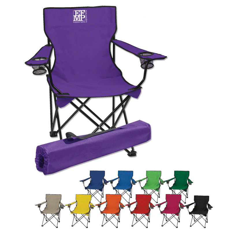 600D polyester chair is durable enough to take along anywhere and can support up to 250lbs. Features armrests with two mesh can holders and folds up to fit in matching carry case with shoulder strap. **If adding a QR code to this product, there is a fee. Please contact your Account Specialist for details.**